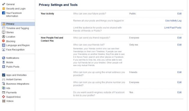Who can look you up using the phone number you provided? Again, you probably don’t need the public using this, so setting it to Friends or Only me will give you more control over your identity.