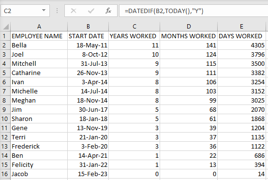Using the =DATEDIF function returns the span of time between two different dates. Let’s say that you wanted to figure out how long your employees had each been working for your business.