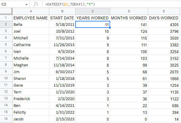 In either Excel or Sheets, all you have to do is list the start dates that each employee began working for your company, and then in the next column, insert the formula cited below. For clarity we’ll assume that your list of dates starts in cell B2. Therefore, you would type the following formula into C2: